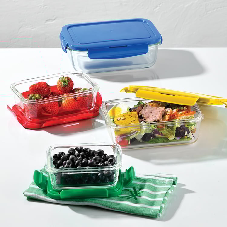 Brighten up your kitchen storage or lunch bag with this container. It is crafted from borosilicate glass that offers durability and can withstand hot food. The lid comes in a bright tone and includes locks on all sides to prevent spillage.
