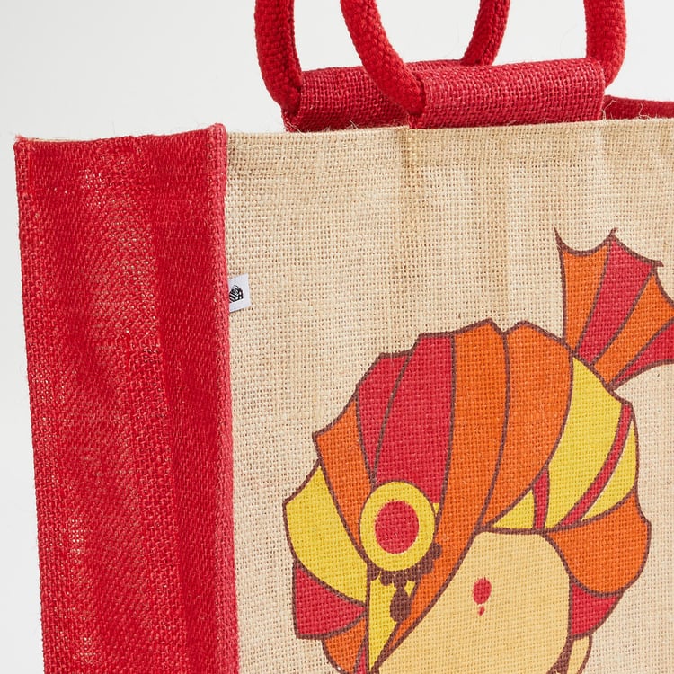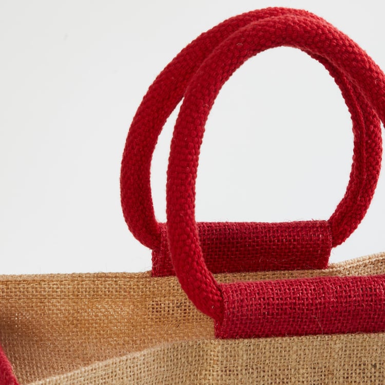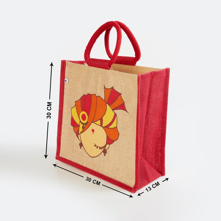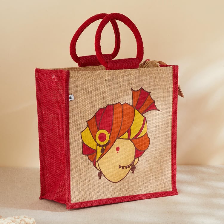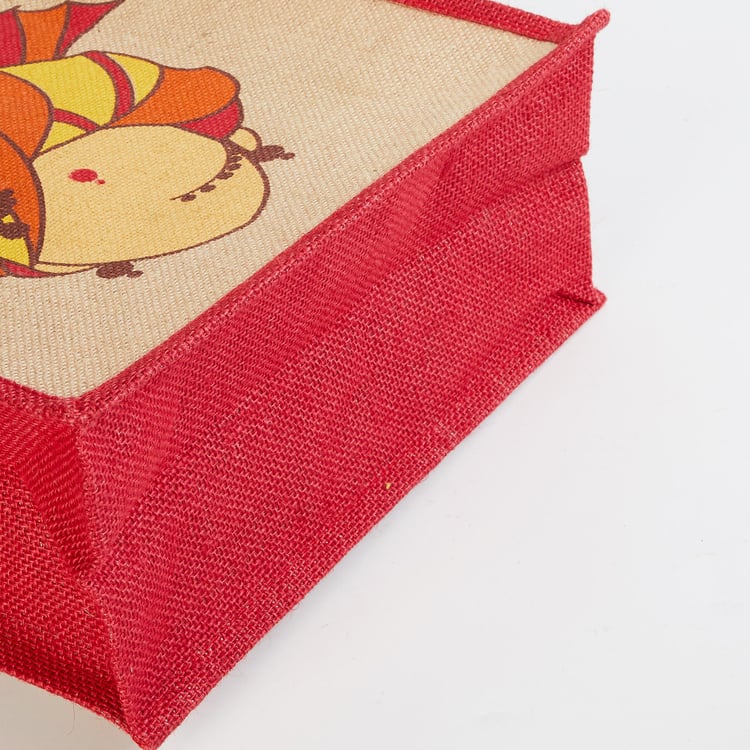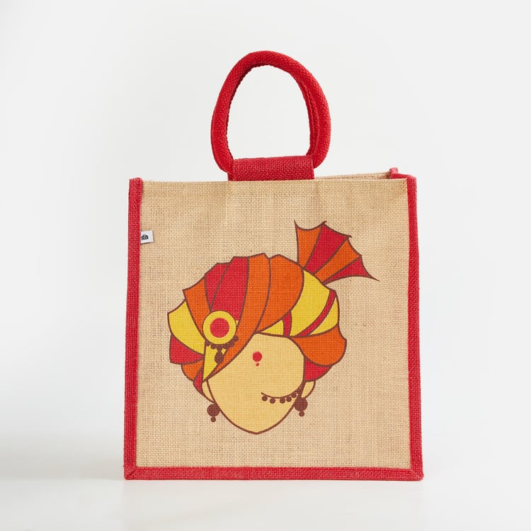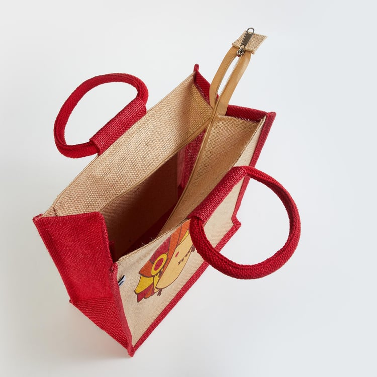 Carry lunch the eco-friendly way with this bag. It is made of jute with rolled handles, a zip top, and prints on either side. This multipurpose bag can be used to carry lunch to school or office or run errands.