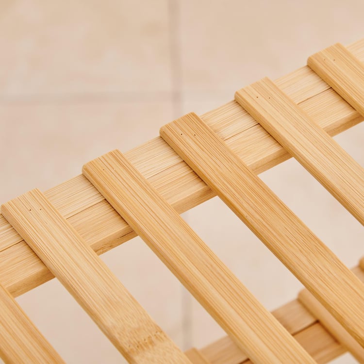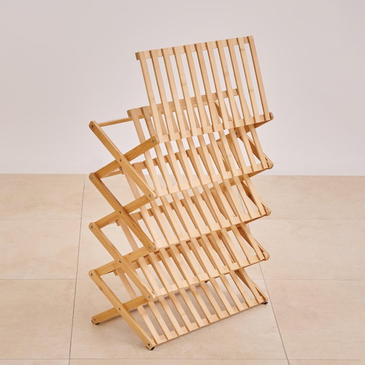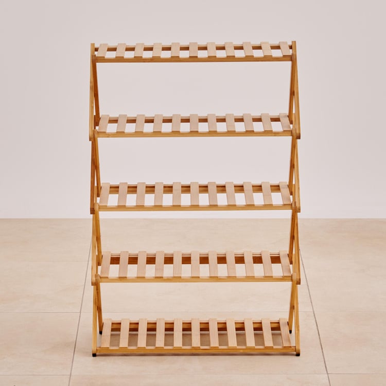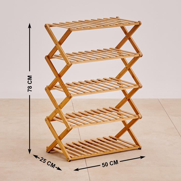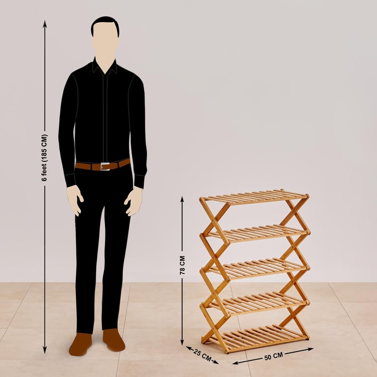 Keep your entryway neat and organised with this shoe rack. It is made of bamboo which is eco-friendly and durable. The folding design helps you save space when not in use. The multi-layered design includes 5 slatted racks that can store up to 10 pairs of shoes. This shoe rack is easy to assemble.