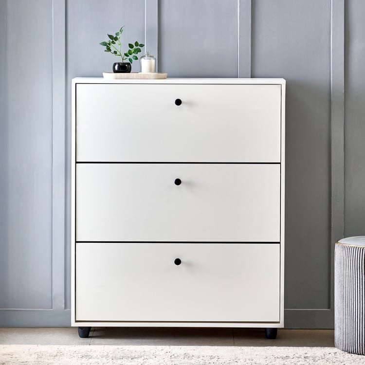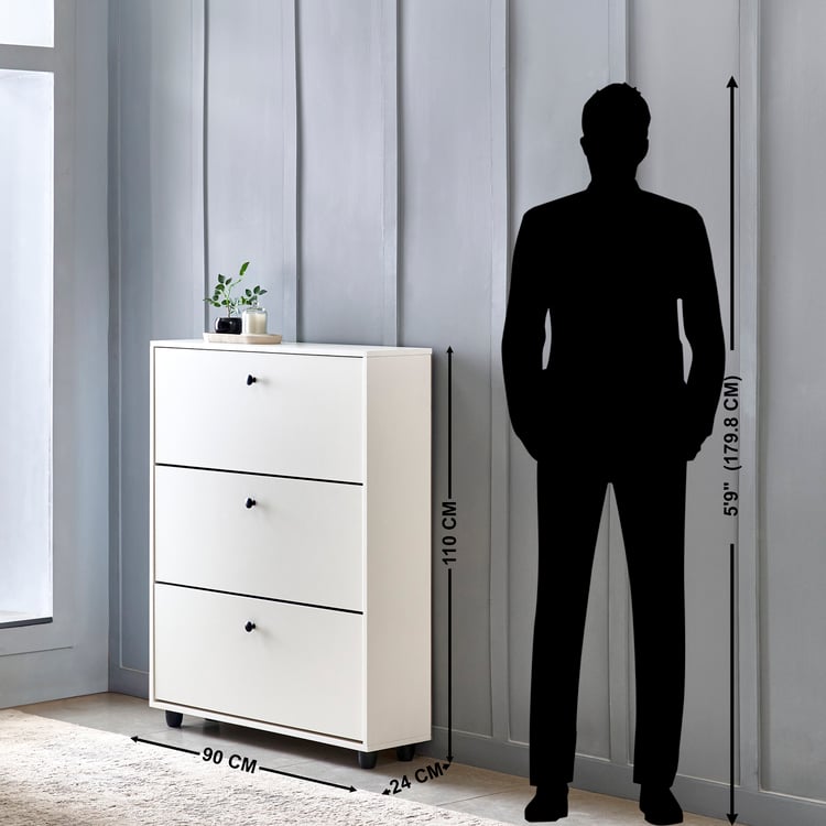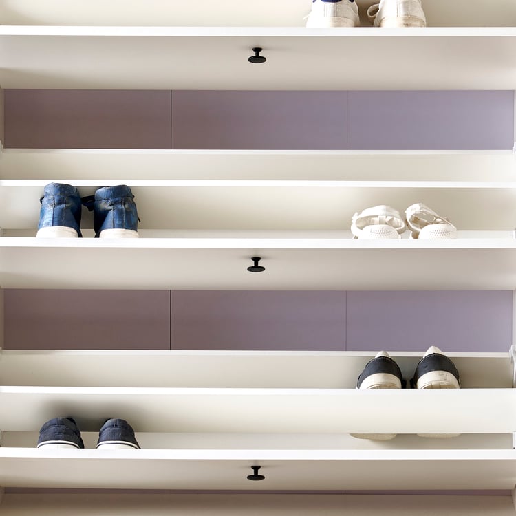 A sleek storage solution, this shoe cabinet is built using pre-laminated engineered wood with a strong, termite- and borer-resistant core and excellent screw-holding capacity. A melamine pre-laminated finish protects against scratches, dents, heat, moisture and stains. It includes 3 drop-down shutters for 18 pairs plus ventilation caps for airflow and odour reduction.