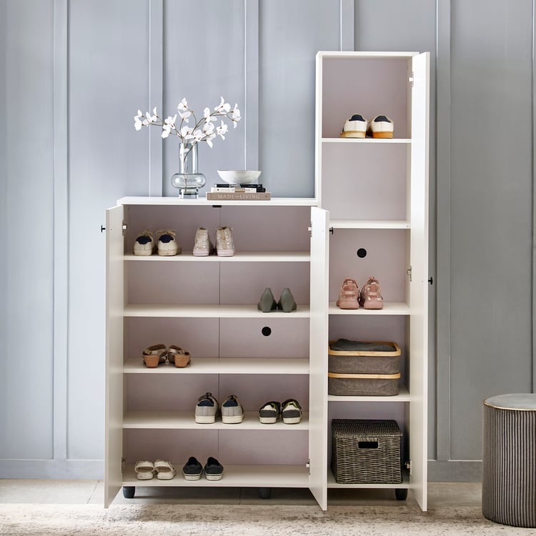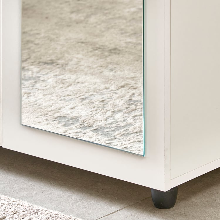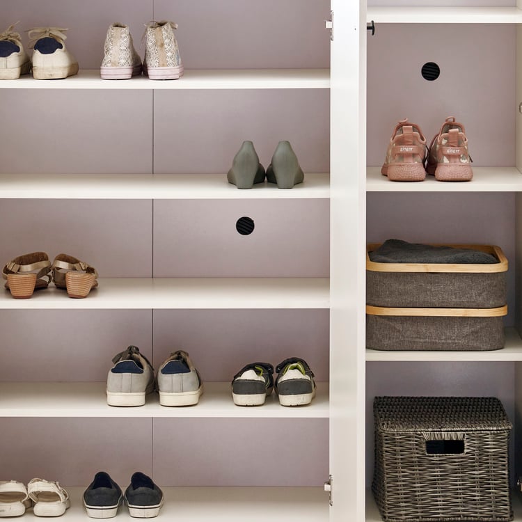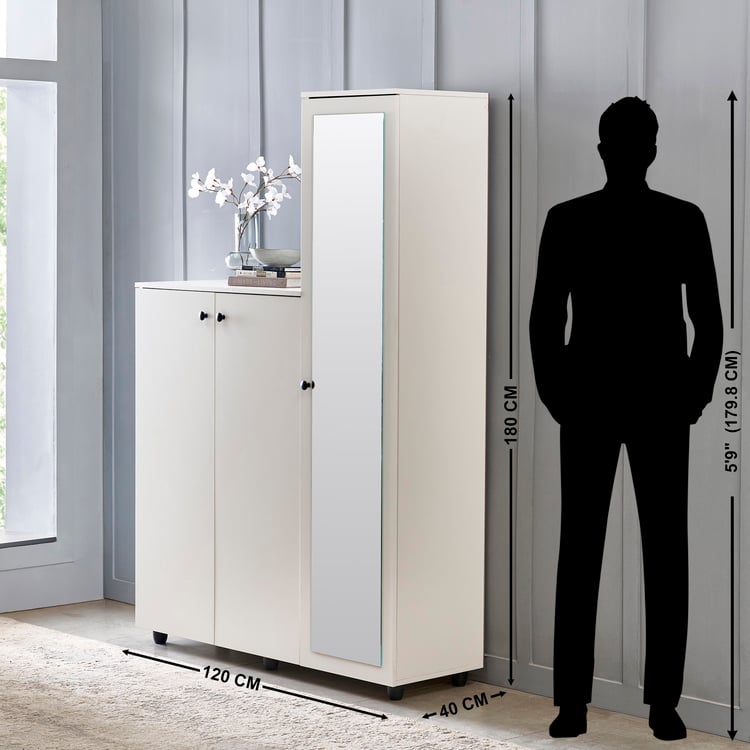 Keep your entryway neat and organised with this 3-door shoe cabinet. It is crafted from pre-laminated engineered wood, offering a dense core with strong screw-holding ability and resistance to termites and borers. Finished in melamine pre-lam, it withstands scratches, heat, moisture, stains, and dents for long-term durability. It includes 8 fixed shelves to accommodate up to 20 pairs, ventilation caps for odour control, and a full-length mirror.