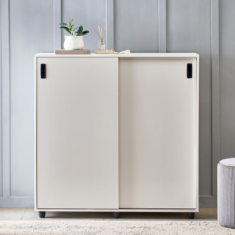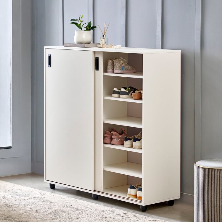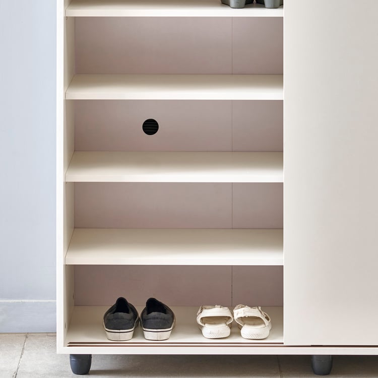 Elevate daily routines with this shoe cabinet that offers smarter storage and better organisation. Made from pre-laminated engineered wood, a fibreboard compressed with hardwood extracts for a stronger core, improved screw-holding capacity, and chemical treatment against termite and borer infestation. The surface is melamine-prelaminated, providing higher resistance to scratches, dents, moisture, heat, and stains. This cabinet features 2 sliding doors for space-saving access, and comes with 5 adjustable shelves that can accommodate up to 24 pairs of shoes. Mesh ventilation caps are included to promote airflow and reduce odour build-up.