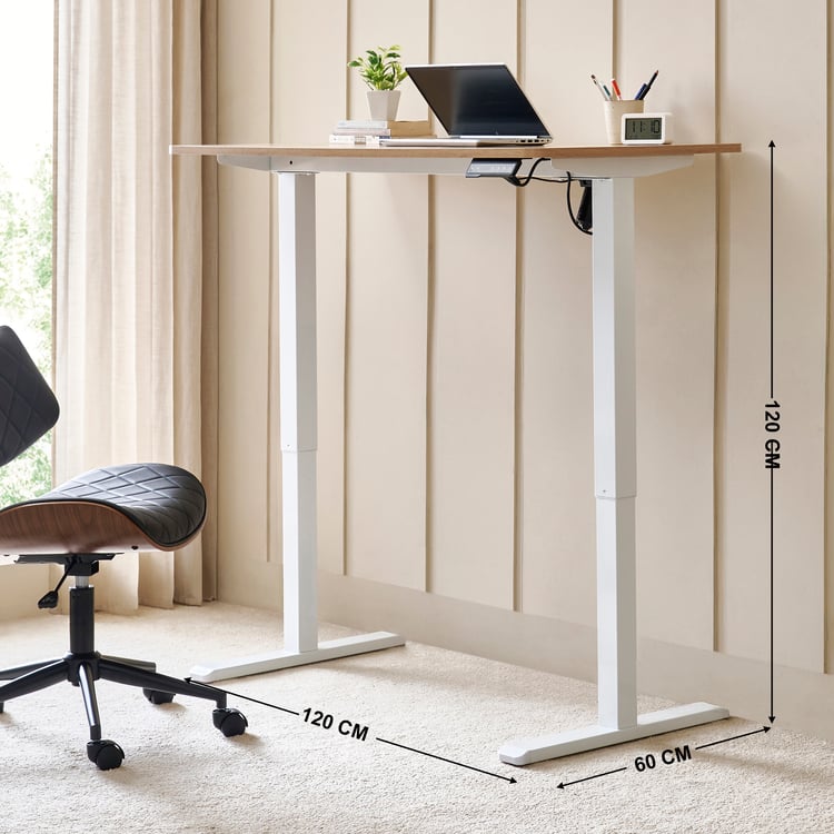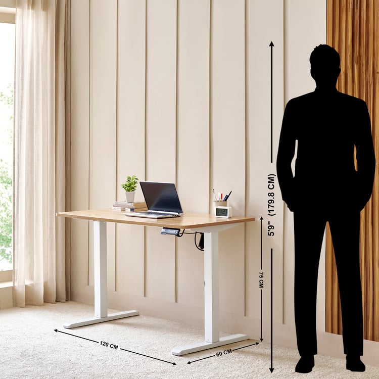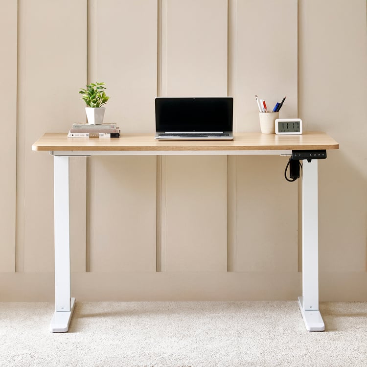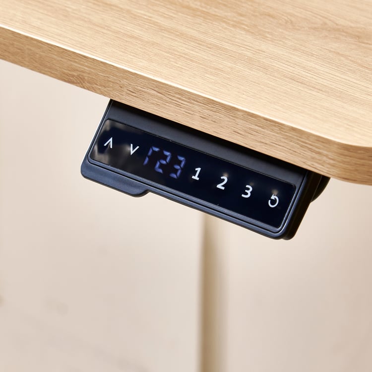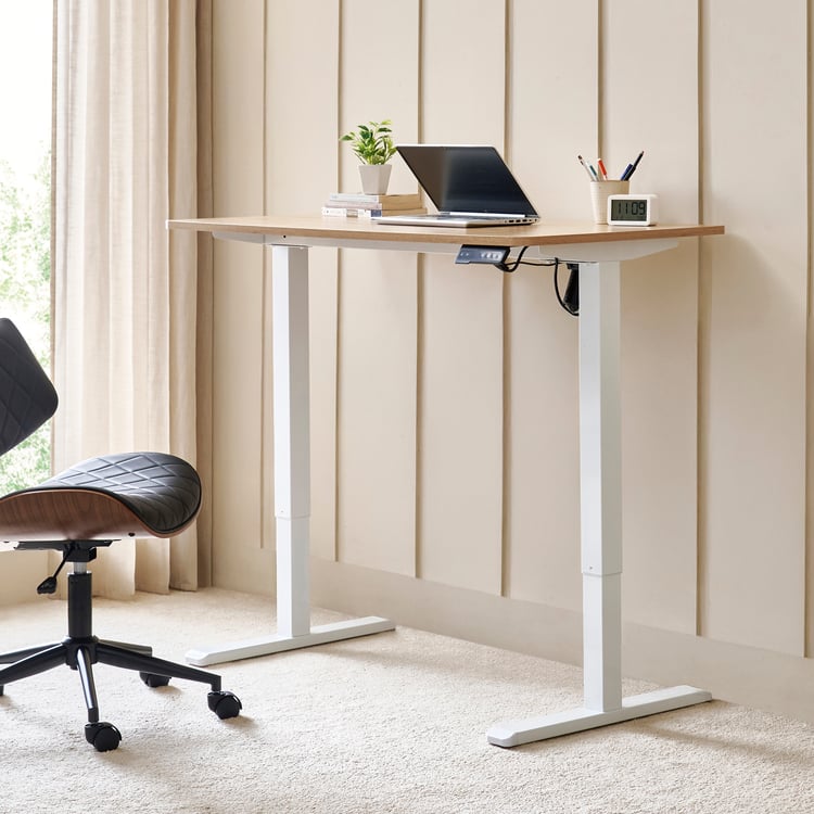 Upgrade your workspace with this smart height-adjustable study desk designed for modern living. Featuring an MDF top with melamine prelam finish, solid wood elements, and sturdy iron legs, it offers durability, termite resistance, and stability. The dual-motor system supports up to 60 kg, while the progressive frame fits multiple desktop sizes. A smart control panel with LED display and memory presets, along with wireless charging, USB 2.0, and Type-C ports, ensures effortless convenience and productivity.