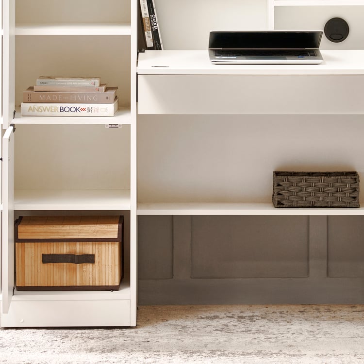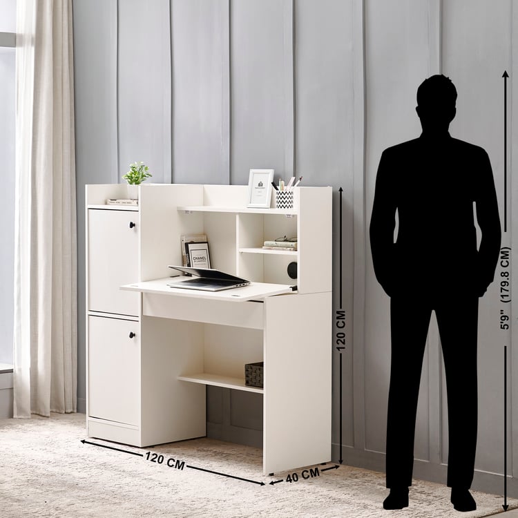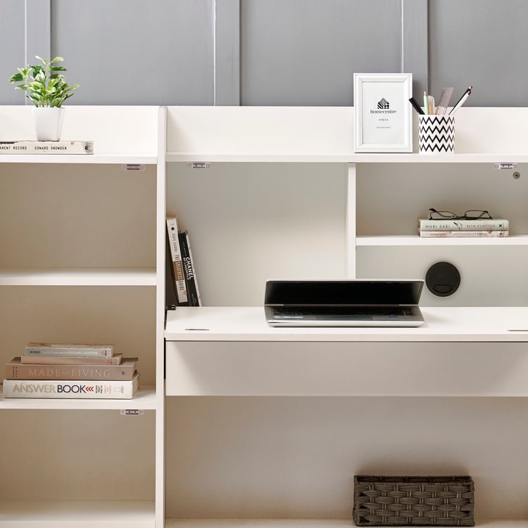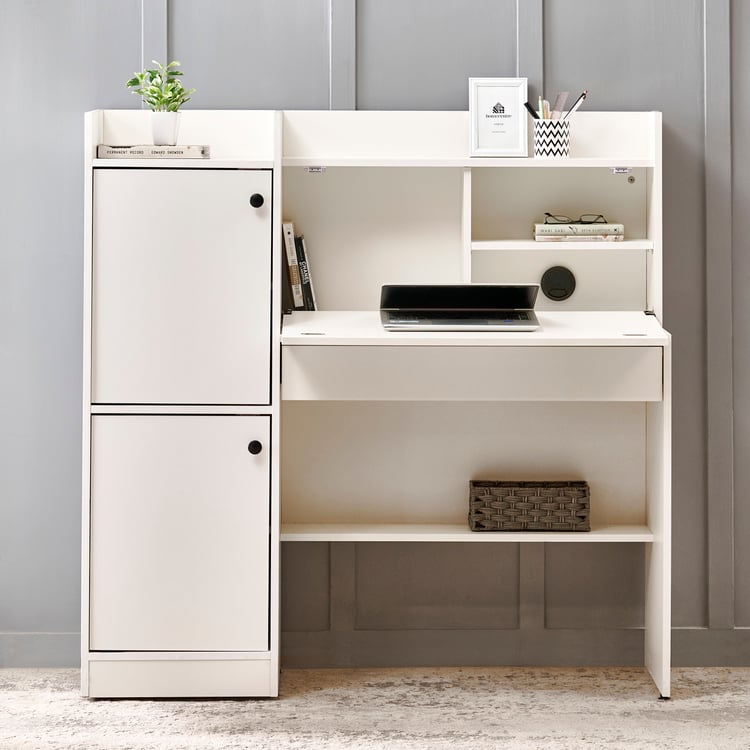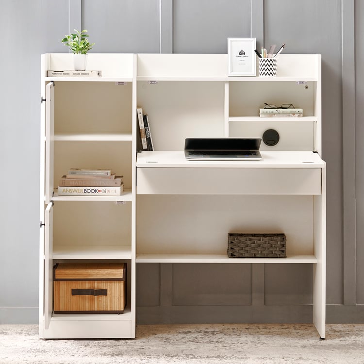 Create a smart, organised workspace with this study desk designed for modern living. Crafted from prelaminated engineered wood with a strong, termite and borer-resistant core, it features a shelving hutch to keep small essentials clutter-free, a flap-down tabletop with cabinet storage for space-saving efficiency, and a dedicated cabinet shelf for secure organisation. The melamine prelam finish offers resistance to scratches, dents, moisture, heat, and stains, while a cable manager hole with a cap ensures a neat and efficient setup.
