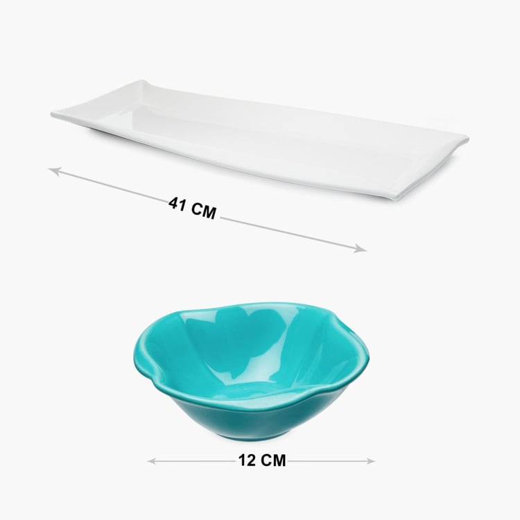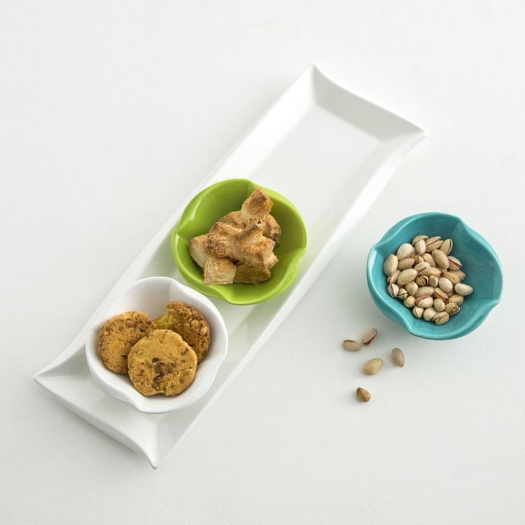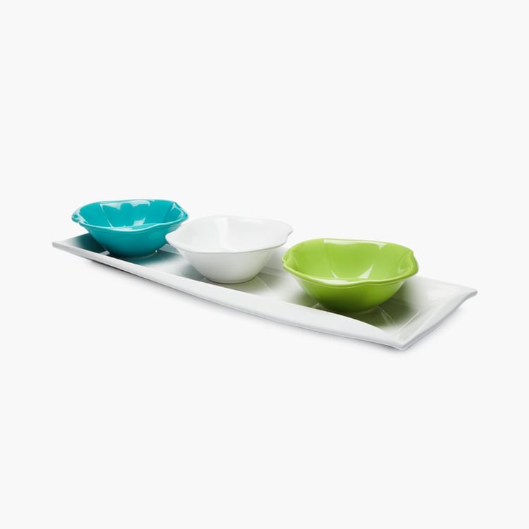 Complete your dining ensemble with this serving platter set which consists of three multicoloured bowls and a tray.