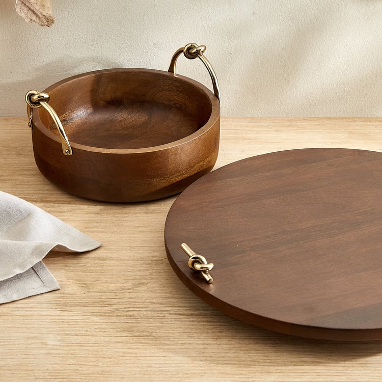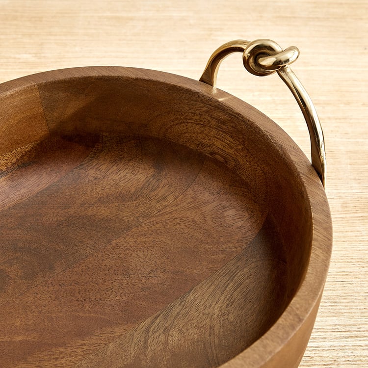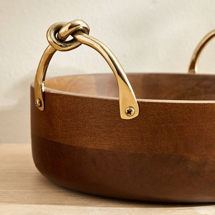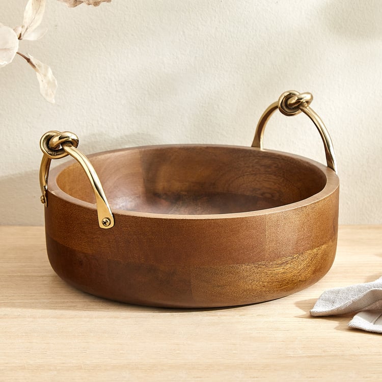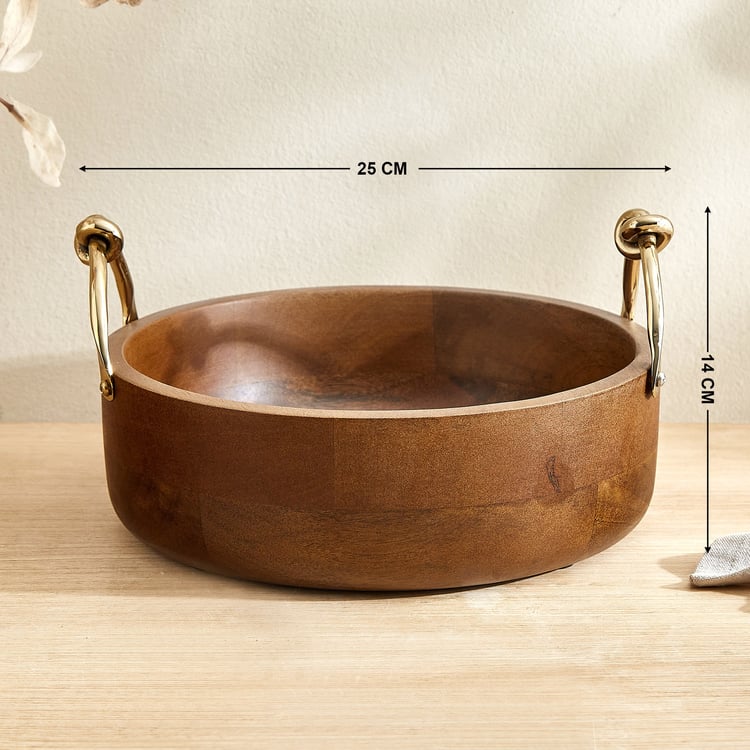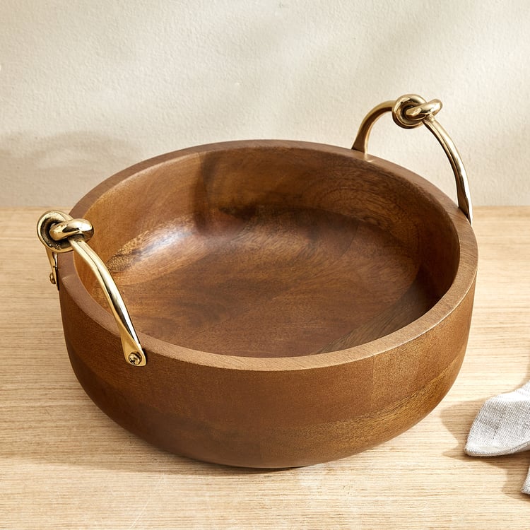 This wooden bowl with metal handles combines rustic charm and modern strength for versatile serving. It offers a sturdy grip, durable construction, easy maintenance, and stylish functionality for enhancing everyday dining.