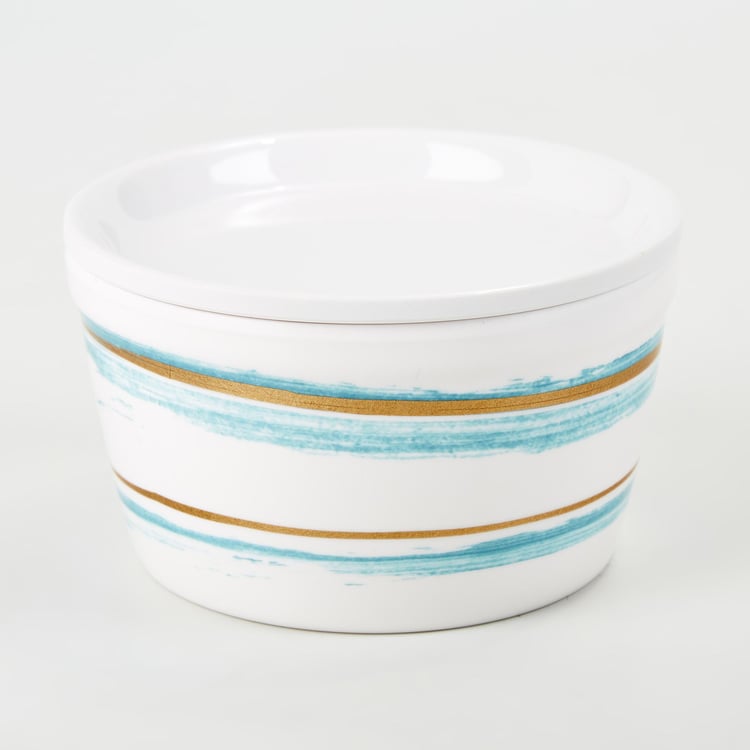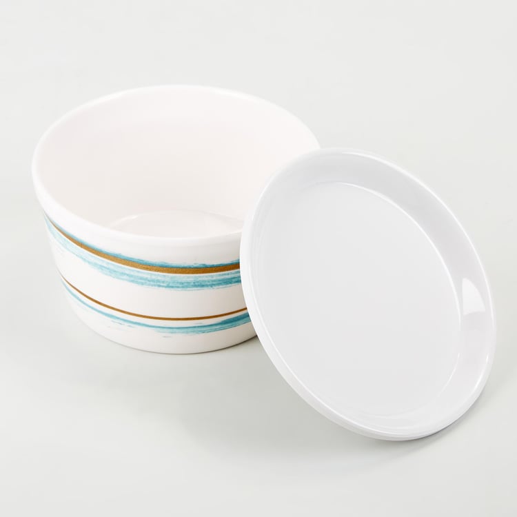 Enhance your coffee time with this beautifully intricate coffee mug from Home Centre. Designed with a printed surface and made of sturdy bone china, this mug is easy to handle, making your coffee time fun and relaxing. This set comprises two serving bowls featuring prints and a lid to protect the content.