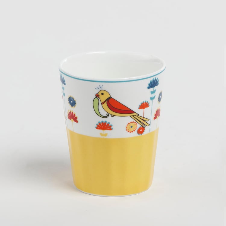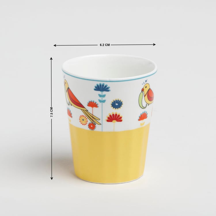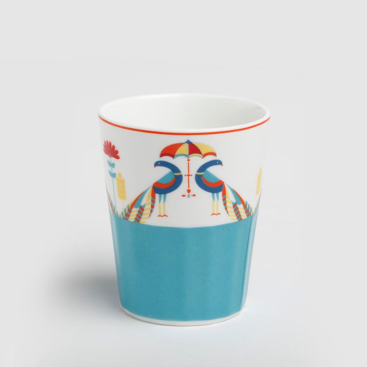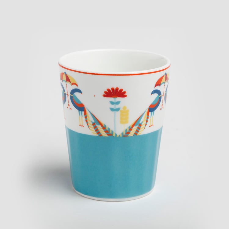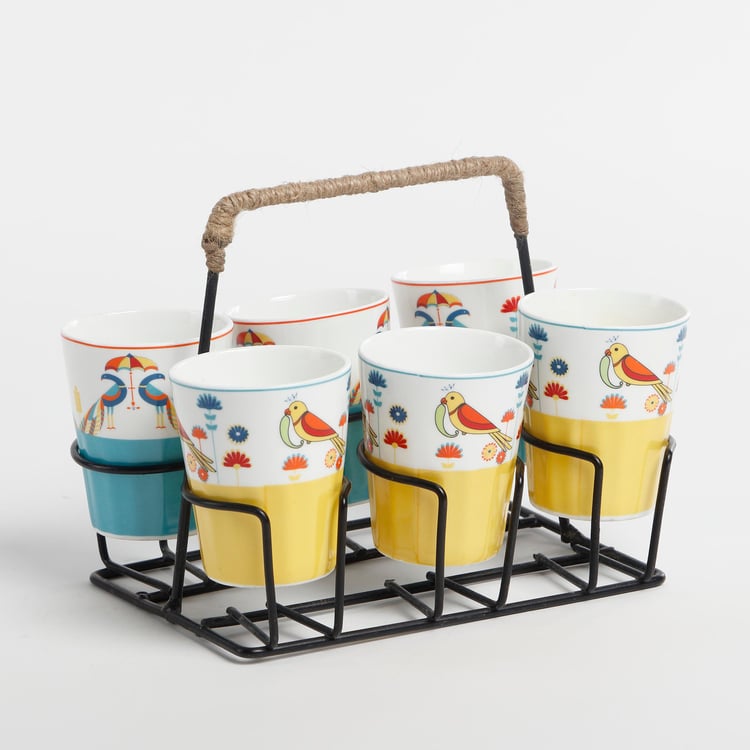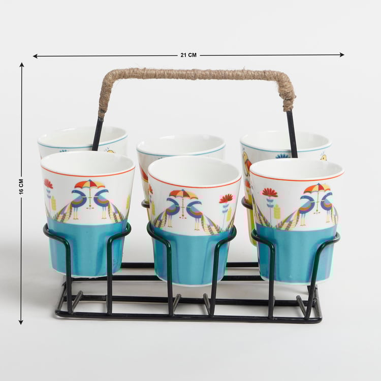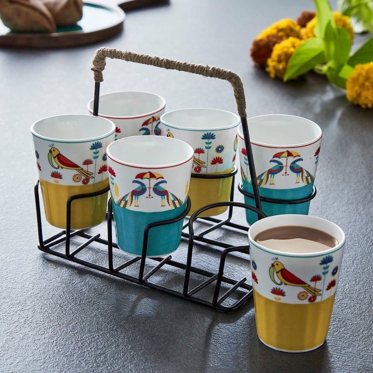 Indulge in some fun with these chai tumblers made of sturdy bone china and a printed surface. This chai set comes along with a metal stand and helps in carrying both hot and cold brewery.
