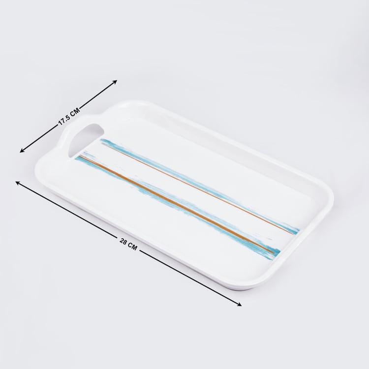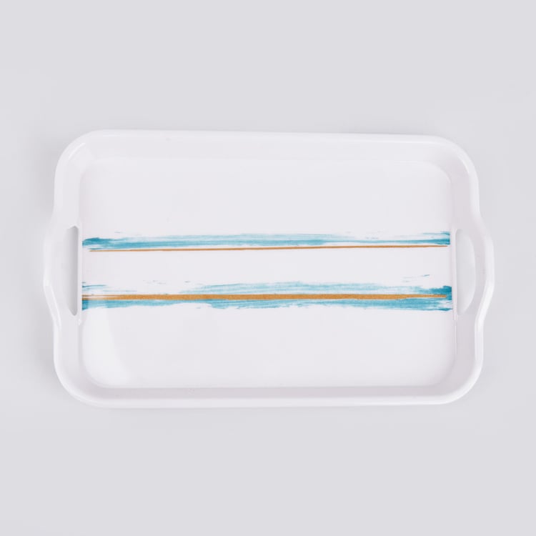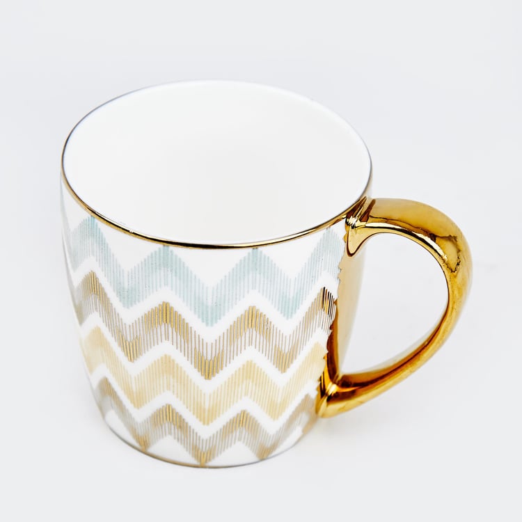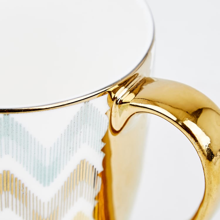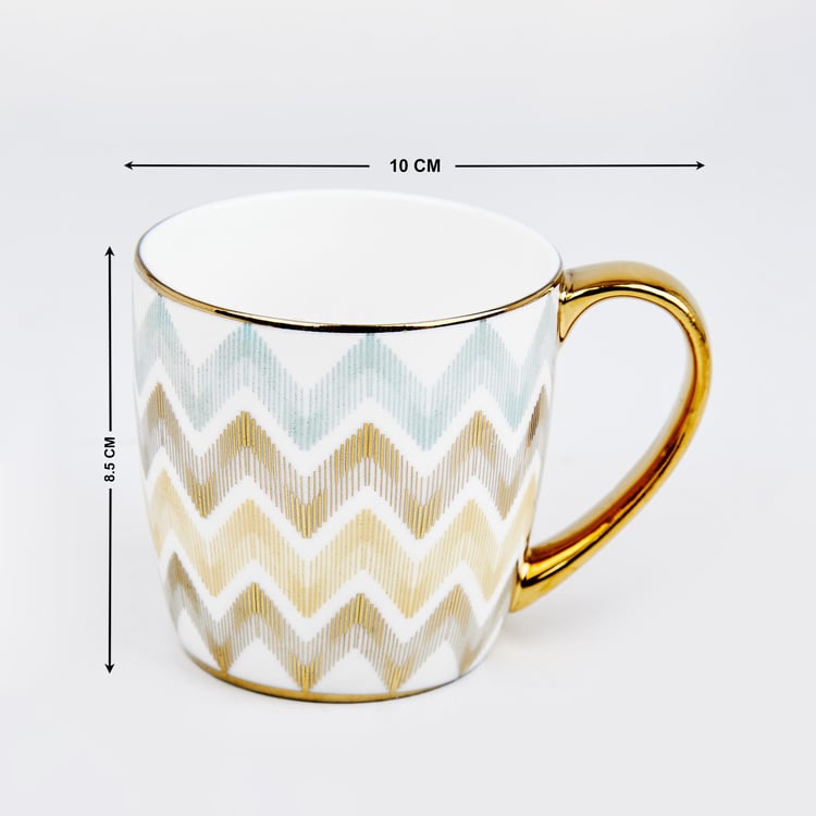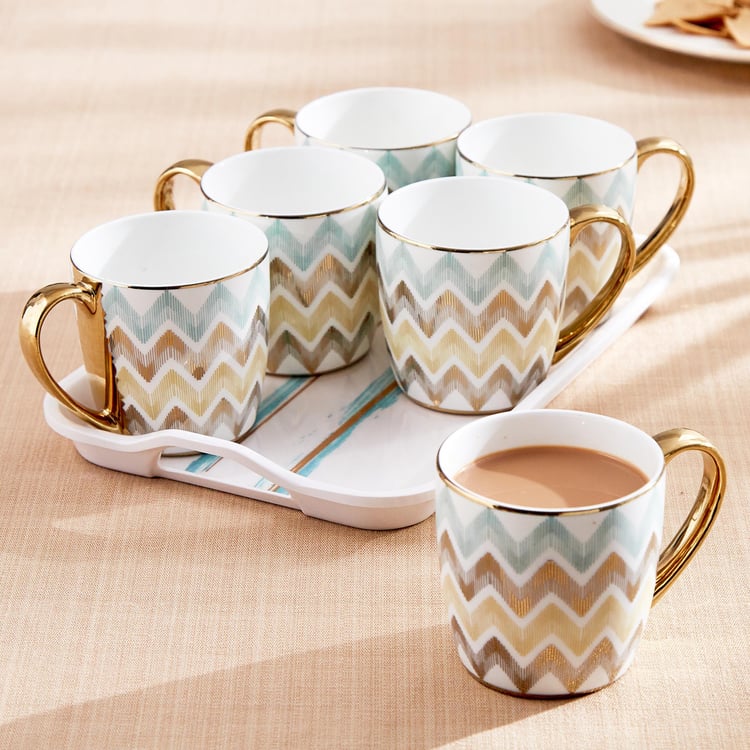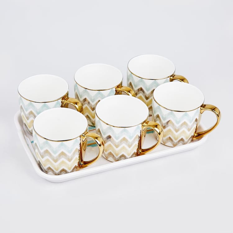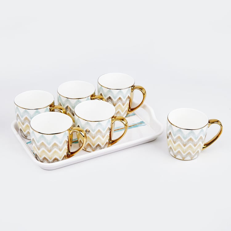 Impress your guests by serving tea in this set of mugs. Made of bone china, these mugs are durable and chip-resistant. The glazed finish makes the surface non-porous to prevent absorption of food material. The chevron prints and gleaming trim give it a luxe touch. This set comes with a melamine tray with a striped pattern and built-in handles for convenience.