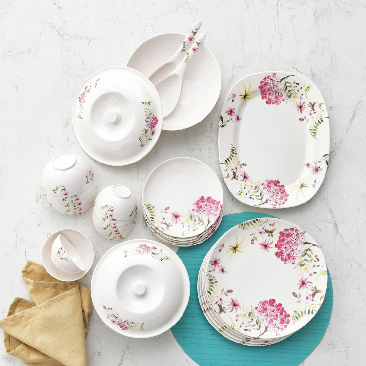 6 Dinner Plates, 6 Side Plates, 6 Katori, 6 Veg Bowl, 2 Serving Bowl, 2 Lids, 2 Serving Spoons, 1 Oval Serving Platter.