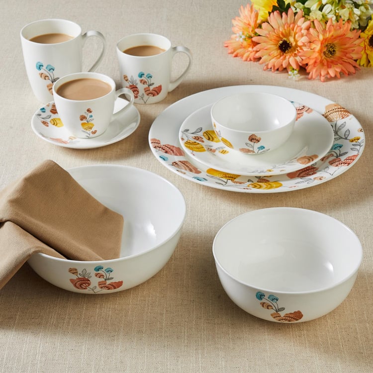 Serve meals in style with this katori. It is made of bone china that is durable and chip resistant. The glazed finish makes the body nonporous, thereby preventing the absorption of food material. The floral prints on the exterior add to the elegance of the dining table setting.
