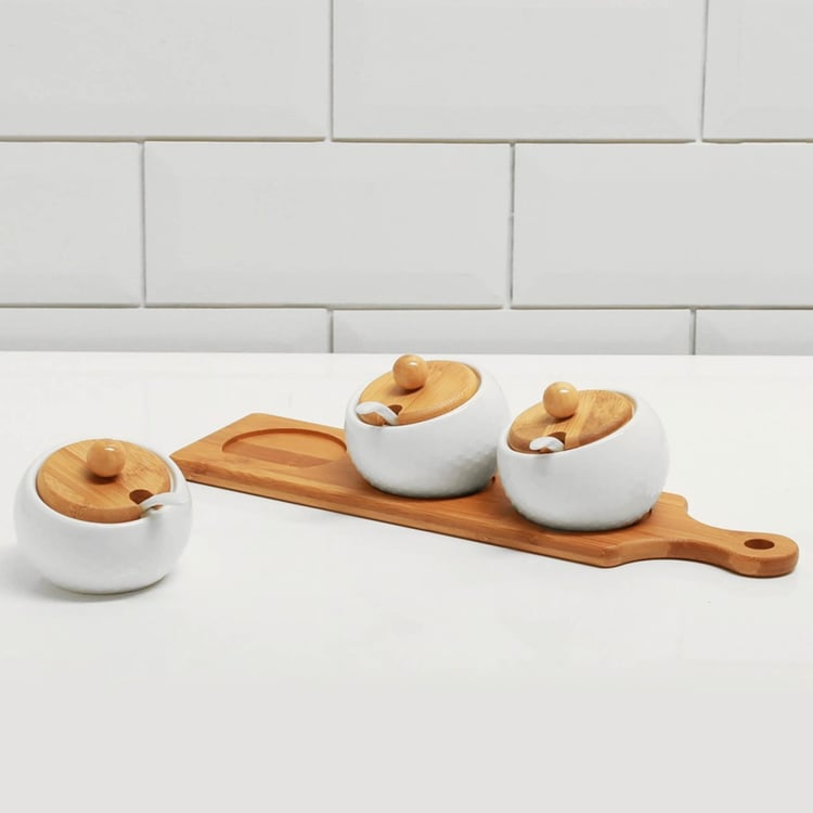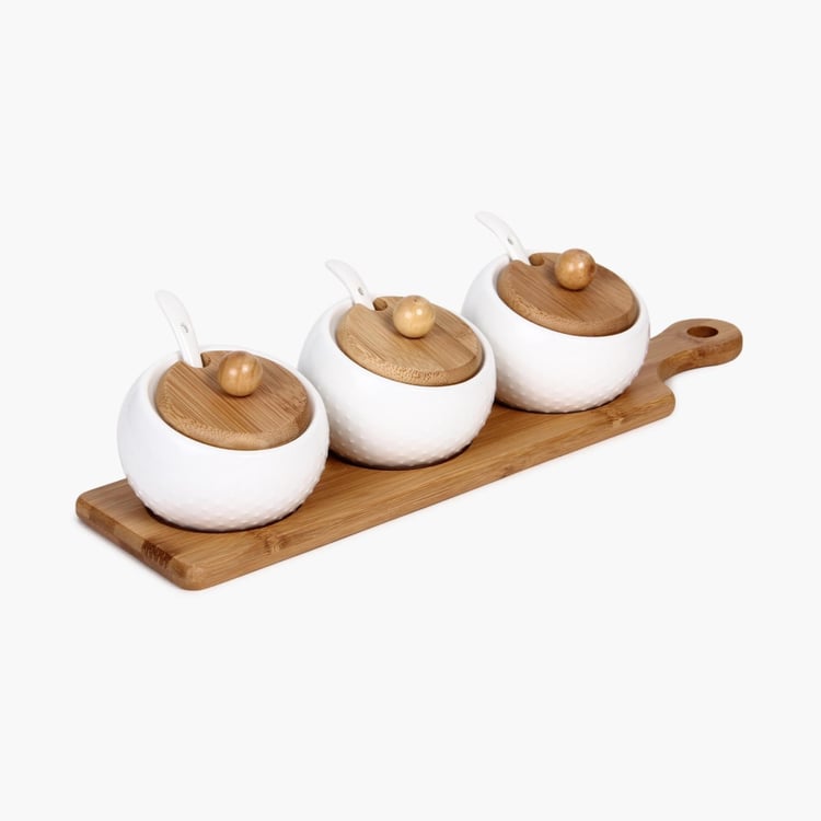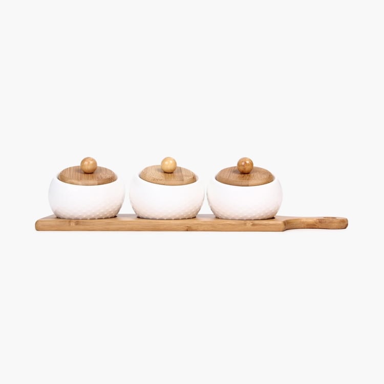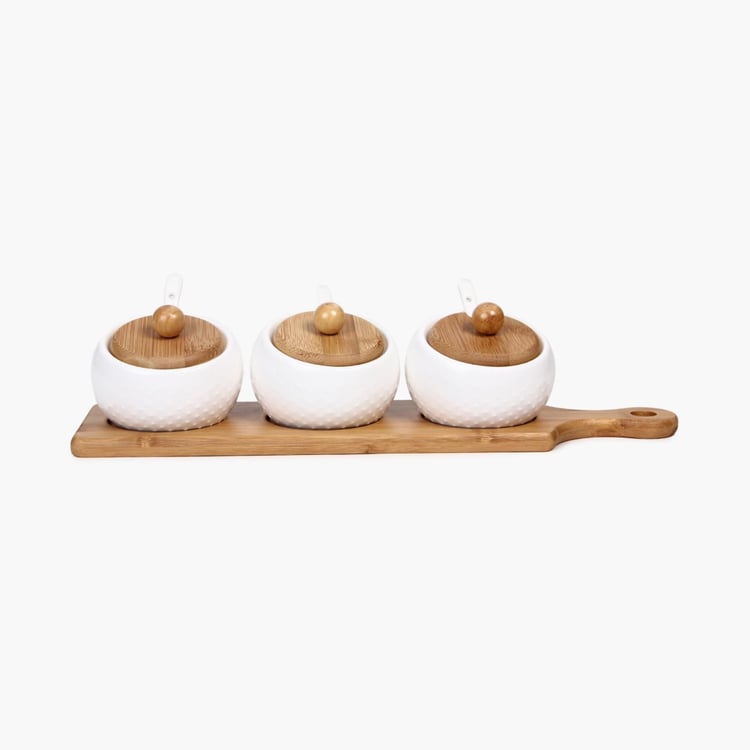 3 Piece Condiment Set With Bamboo Tray