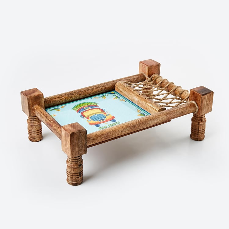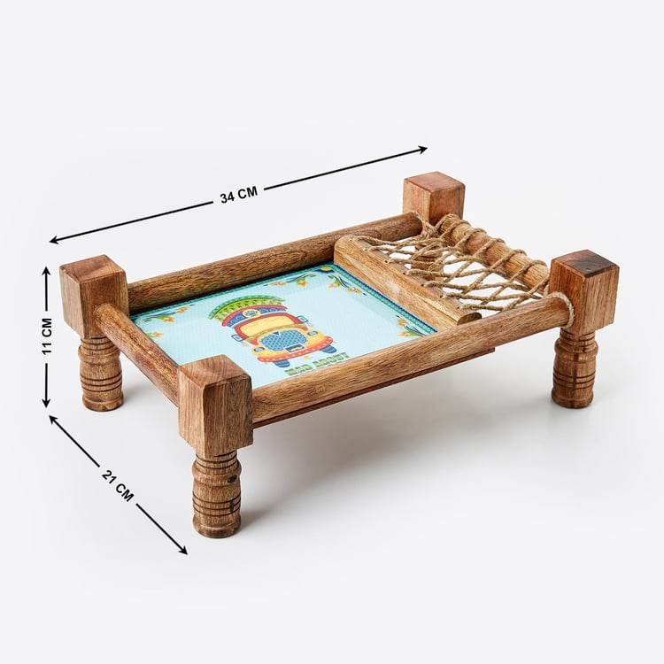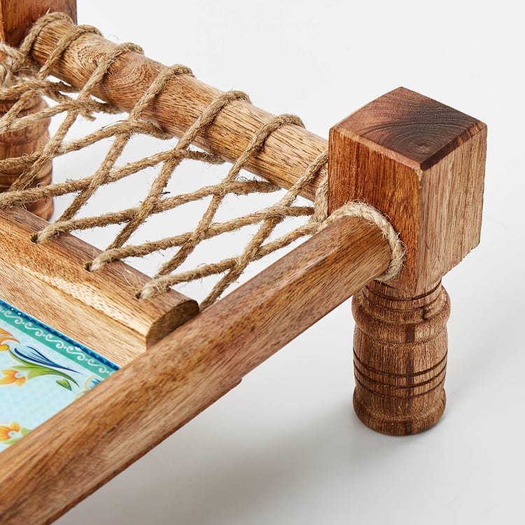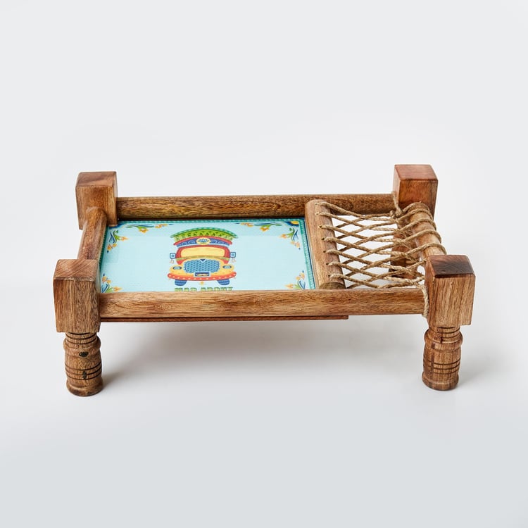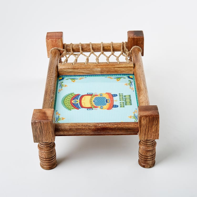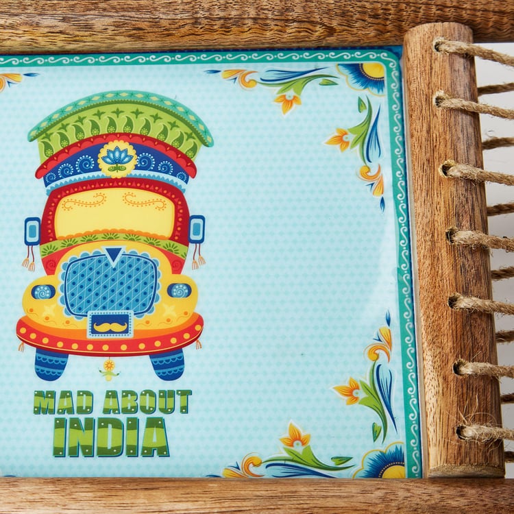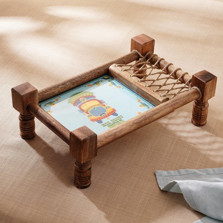 Add a quirky, unique touch to your dinner table with this serving platter. Designed to look like Khatiya, this platter is made of mango wood and MDF. It has an enamel coating that gives it a shiny and clear look. The platter has raised edges for convenient serving. The vibrant prints and the woven partition detail elevate the overall look.