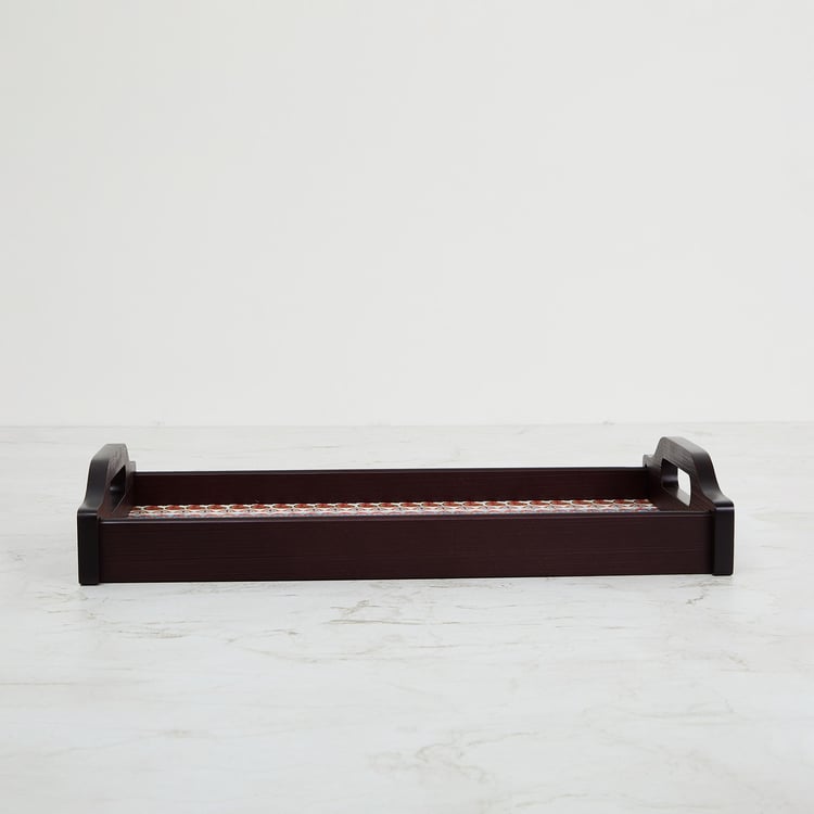 Bring convenience to your dinner table with this classic serving tray that comes with a printed design. It has been crafted from fine-quality material for extended durability. The MDF wood makes it stiff, and laminate gives a shiny and clear look. The ergonomically designed cut out handles provides the tray with a comfortable grip. Easy to clean and maintain this tray is comfortable to carry in hand. It comes with durable handles on both sides to serve those hot dishes easily. It can used as a snack tray, drink tray, kitchen tray, appetizer tray, nesting tray, home decor displays, party platter and trays.