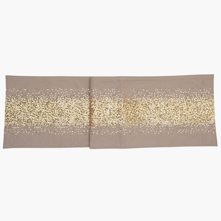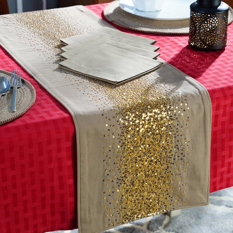 Add a touch of festive sparkle to your dining decor with this table runner and napkin set, designed for an elegant and coordinated table setting. Made from cotton fabric, it offers a soft feel with durability suitable for everyday or special occasion use. The set includes a 4-seater table runner embellished with sequin detailing and four matching napkins featuring striped stitching, all neatly packed in a box for convenient styling or gifting.