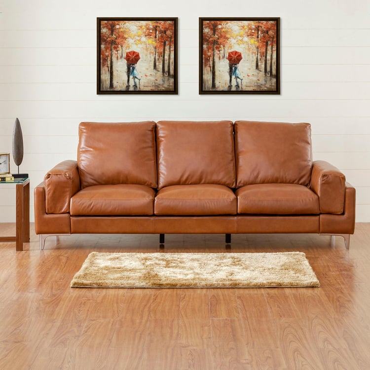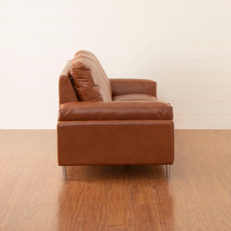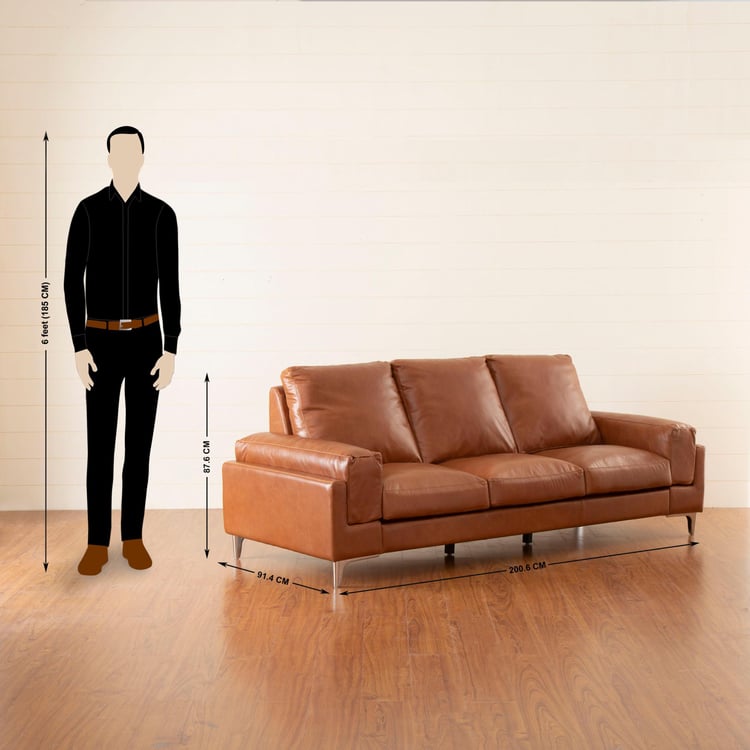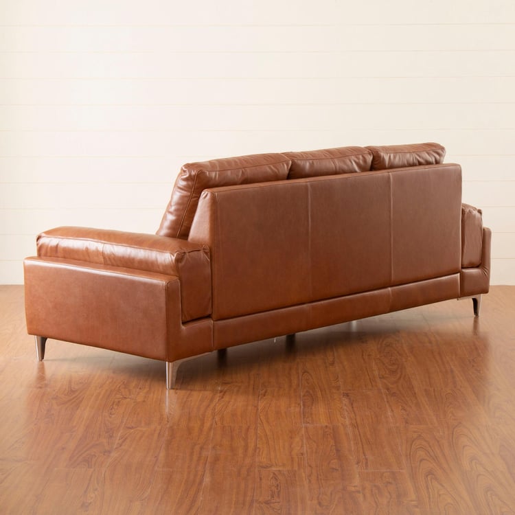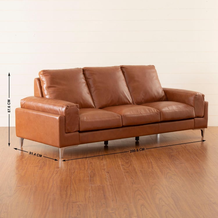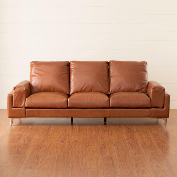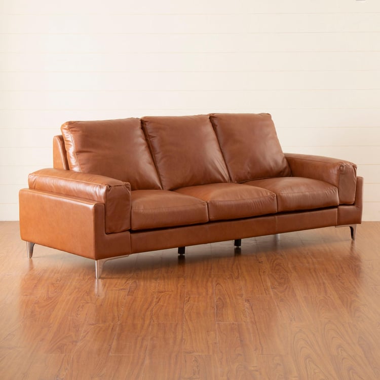 Meticulously crafted from solid pinewood, this three-seater sofa has comfort written all over it. Stuffed with plush foam and spring, this sofa comes with a solid design and a cosy armrest. The upholstery is made from hiqh range bison brute leather and is a much more breathable, supple material which provides warmth to human body. The construction of the sofa has no back spring which provides high resilience and durability. It also has a elastic nylon webbing for greater support and comfort. The metal legs of the sofa provide excellent durability and load bearing capacity. It also has a removable flat seat along with adequate lumbar support for long seating.