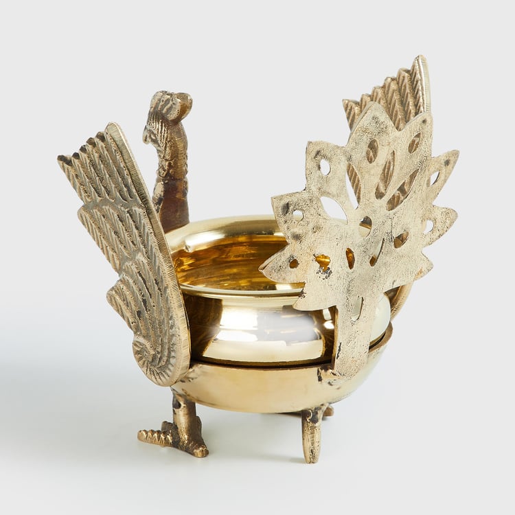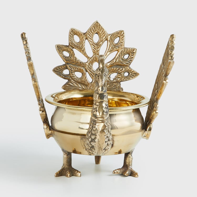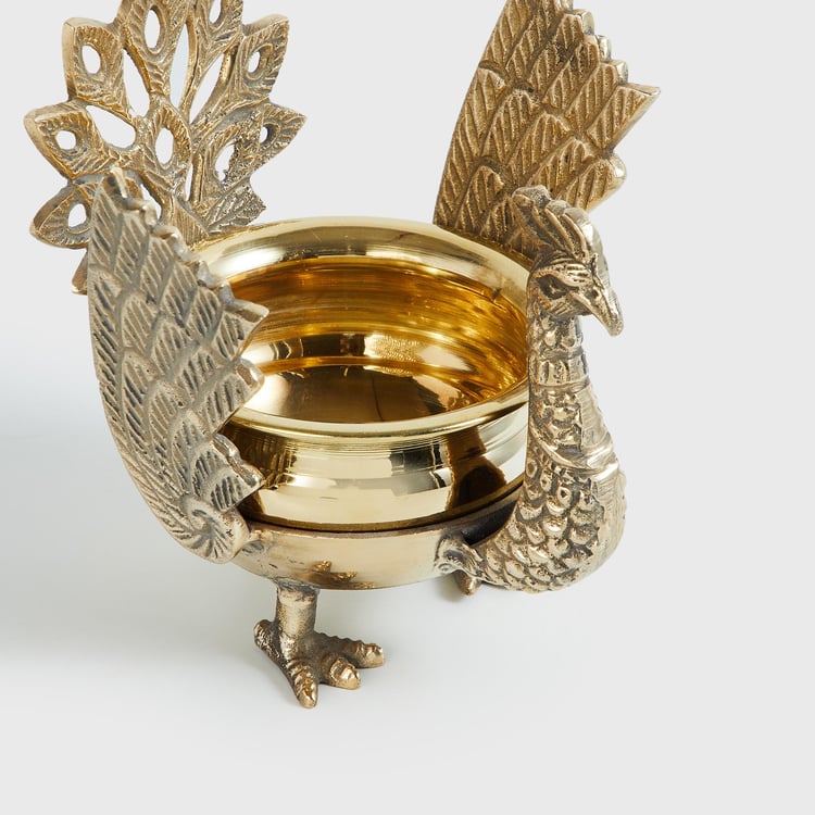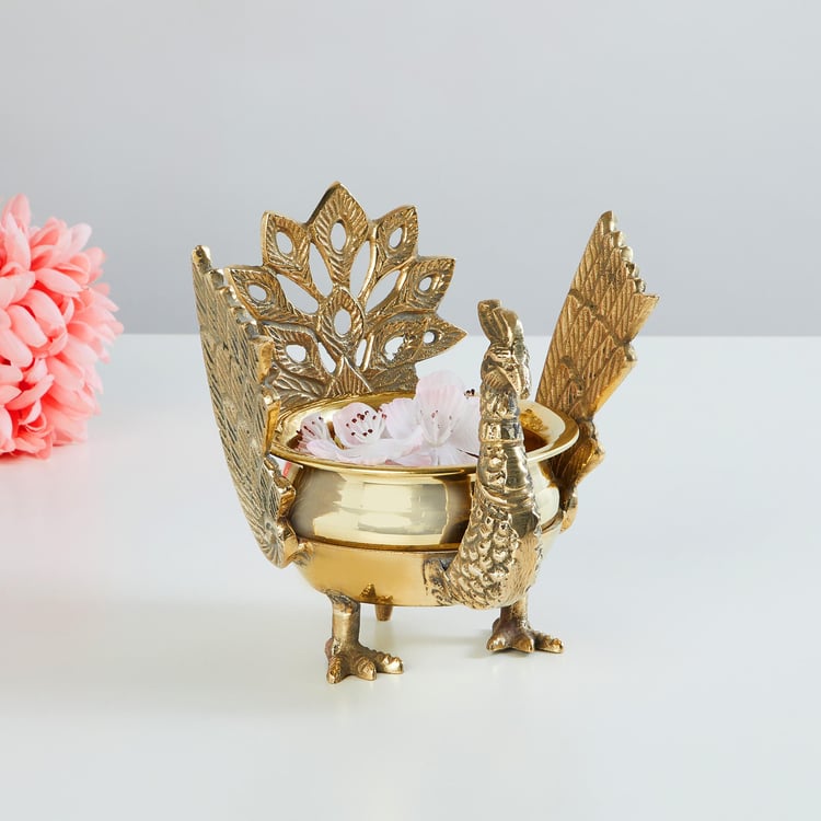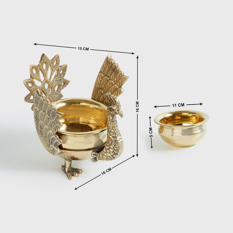 Enhance the decor with this beautiful traditional pooja bowl. It features a peacock figurine and a removable bowl to place flowers.