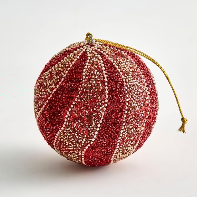 Decorate your home this Christmas with this bauble designed with bead embellishments and a round form. The gold and red hue add an extravagant gleam to the bauble. Hang it on the Christmas tree for that radiance.