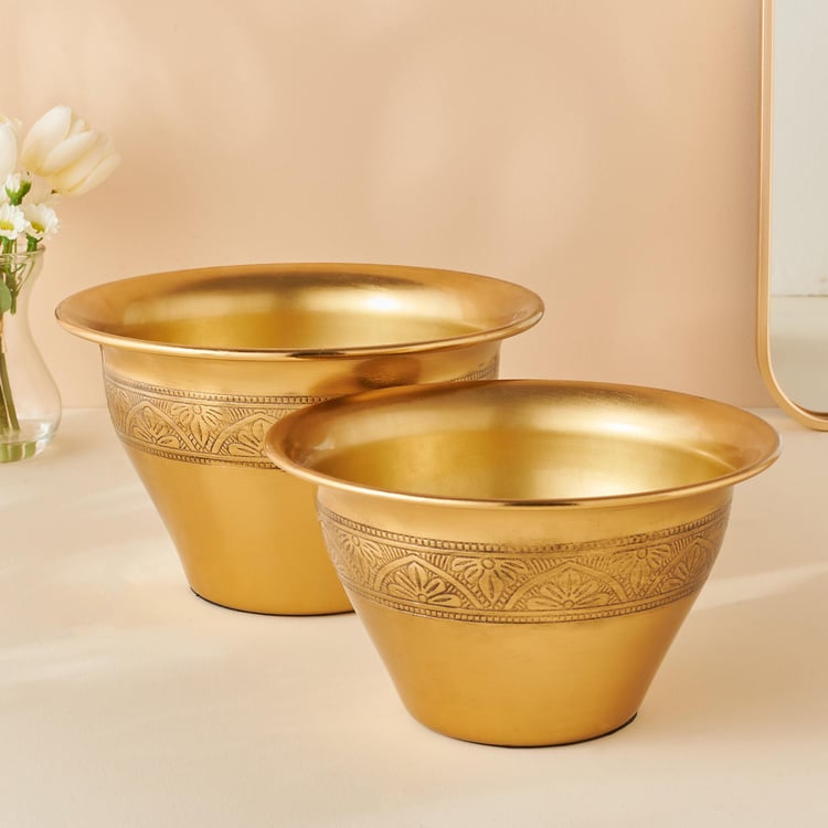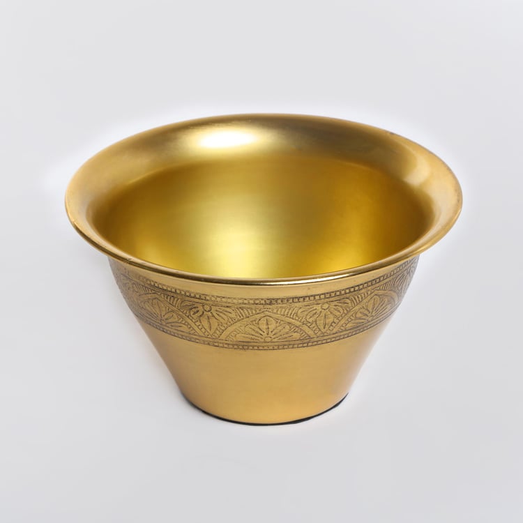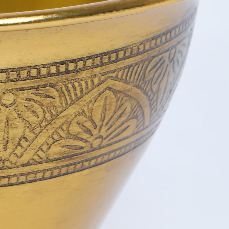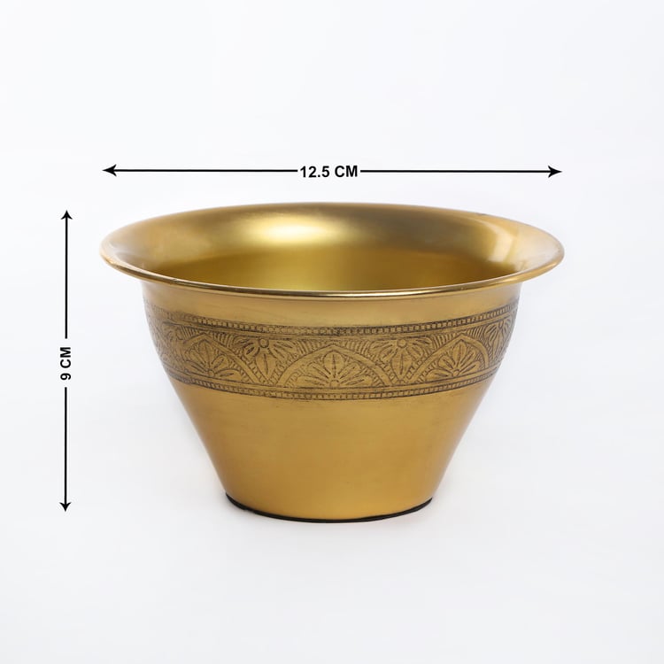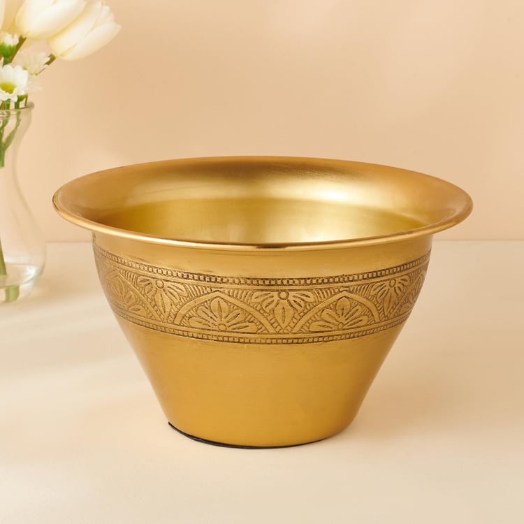 This planter is a stylish pick to adorn your living space. The etching and finish add to your decor. Place it indoors or outdoors to house your artificial or real plants.